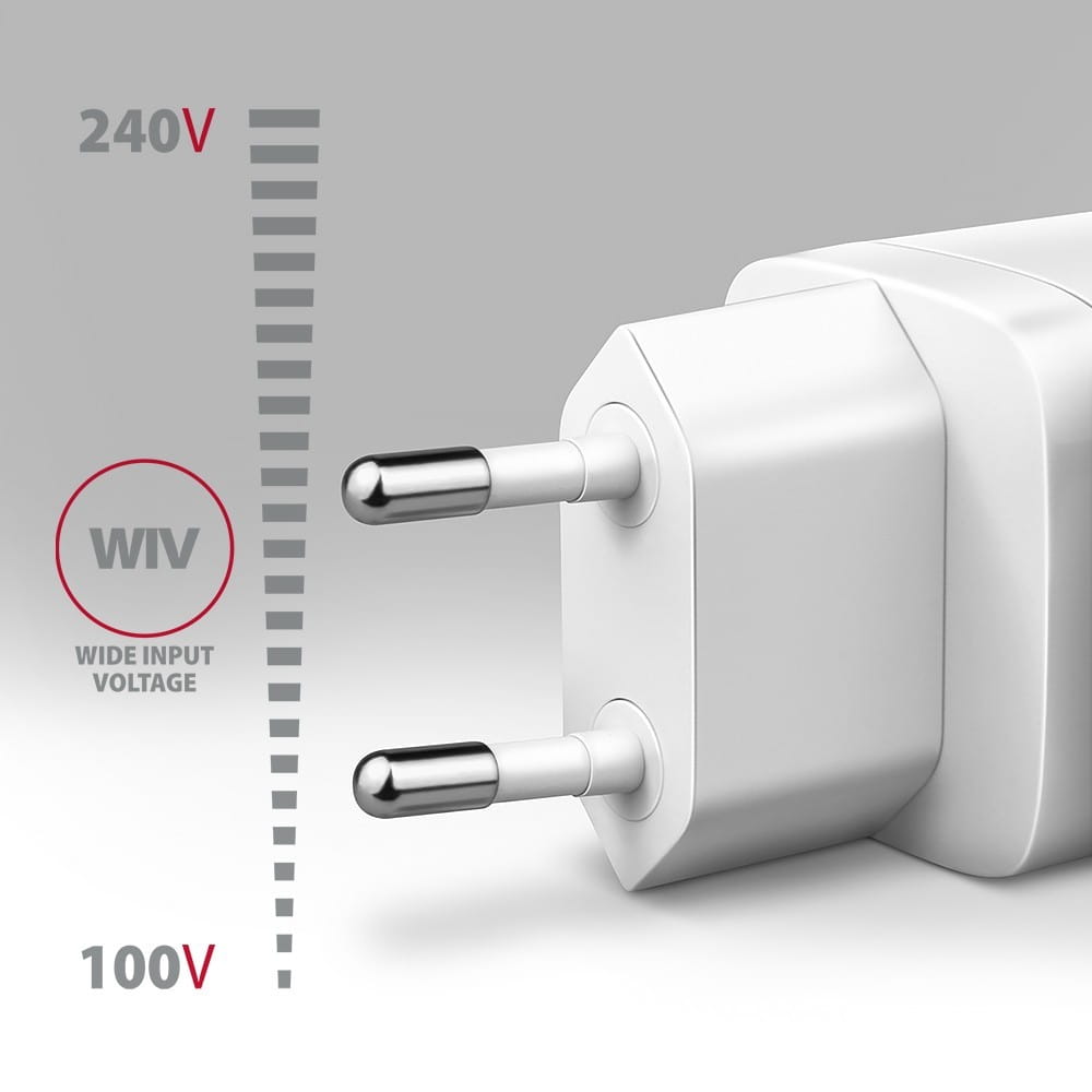 Wide Input Voltage - funkcja szerokiego zakresu napięcia wejściowego, chroni adapter przed pod napięciem i nadnapięciem na wejściu i umożliwia wykorzystanie większej ilości "narodowych standardów ładowania".
