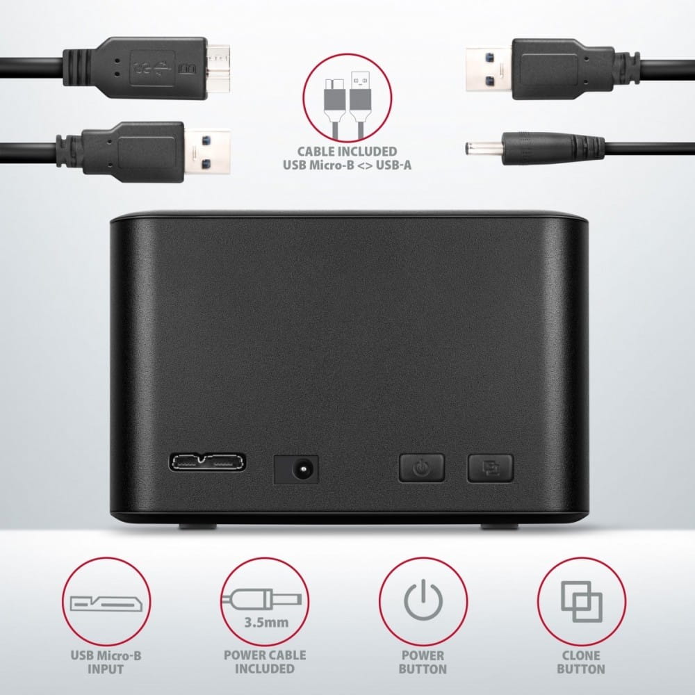 Akcesoria w zestawie: stacja dokująca SSD/HDD, kabel USB Micro-B USB-A o długości 60 cm, kabel zasilający 100 cm, podręcznik wielojęzyczny CZ / DE / DK / ENG / ESP / FIN / FR / GR / HR / HU / IT / NL / PL / PT / RO / RU / SK / SWE / TR / BG / CN / ARA, pakowane w pudełku kartonowym.