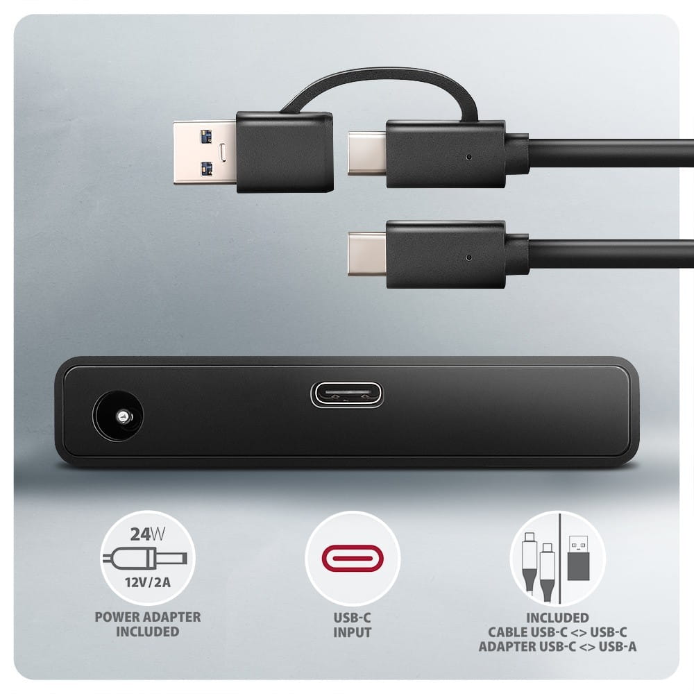 W zestawie znajduje się kabel 60 cm USB-C USB-C z zamontowaną redukcją USB-C -> USB-A. Rozwiązanie to zwiększa uniwersalność adaptera, dzięki czemu można podłączyć go do dowolnego portu USB w komputerze, niezależnie od tego, czy jest to dwustronne złącze USB-C, czy tradycyjne złącze USB-A. W zestawie znajduje się również adapter zasilania 12V/2A (24W) do zasilania dysków twardych 3.5. Adapter z 2.5" dyskiem SSD/HDD może być zasilany przez magistralę USB, eliminując potrzebę stosowania zasilacza sieciowego.