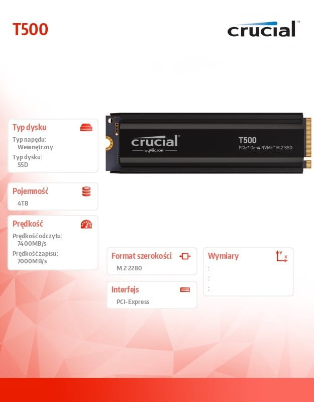Crucial Dysk SSD T500 4TB M.2 NVMe 2280 PCIe 4.0 7000/6900 Radiator