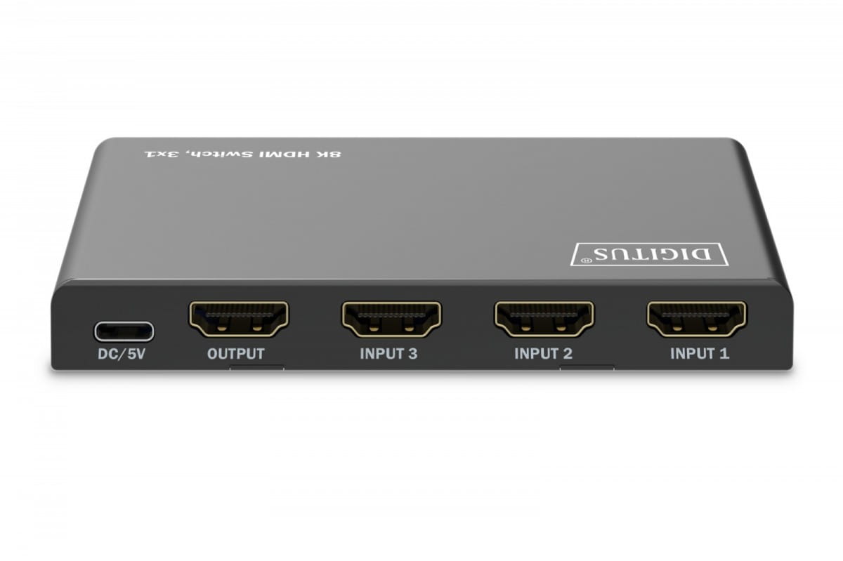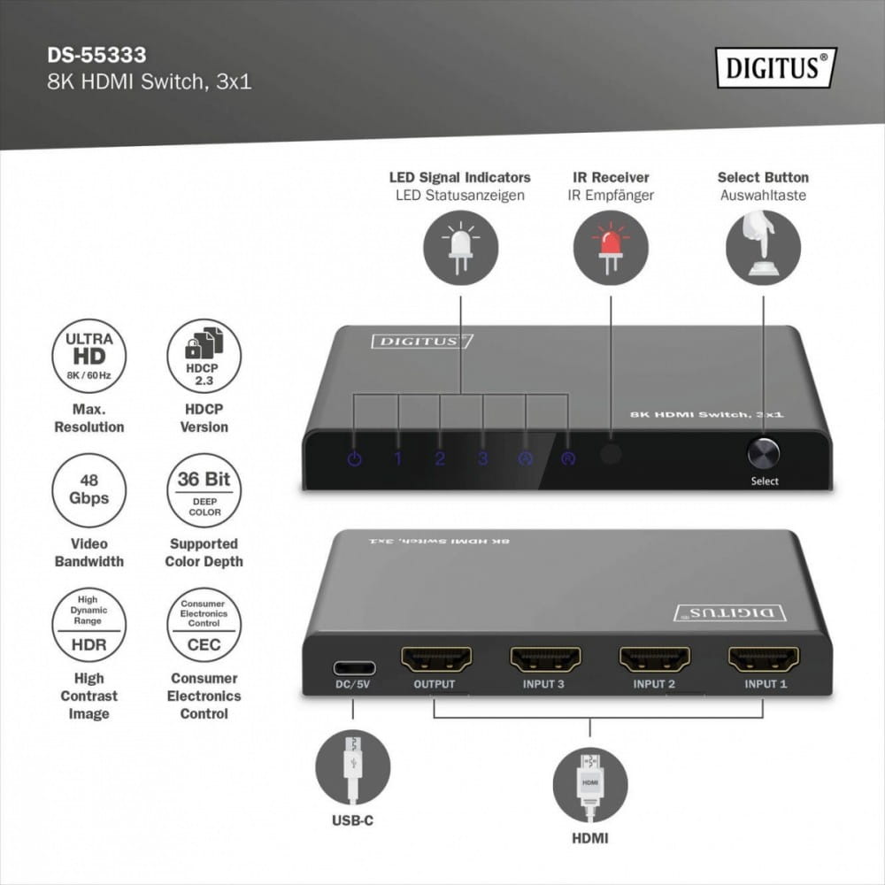 Digitus Przełącznik/Switch 8K HDMI 3x1, 60Hz (4:4:4), HDR, HDCP 2.3, pilot, Czarny