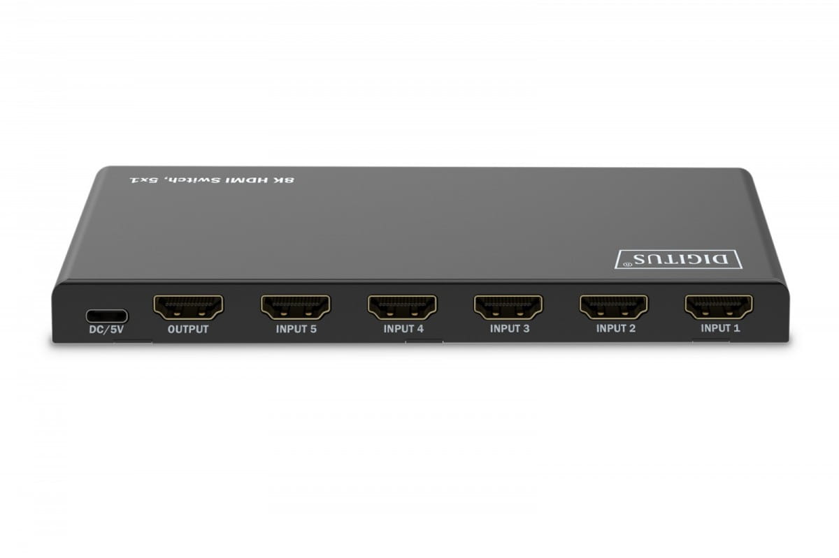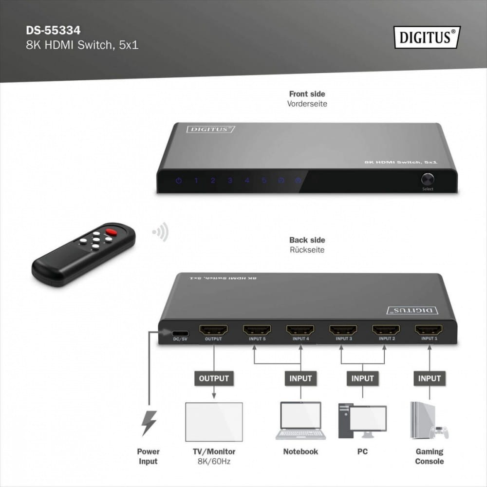 Digitus Przełącznik/Switch 8K HDMI 5x1, 60Hz (4:4:4), HDR, HDCP 2.3, pilot, Czarny