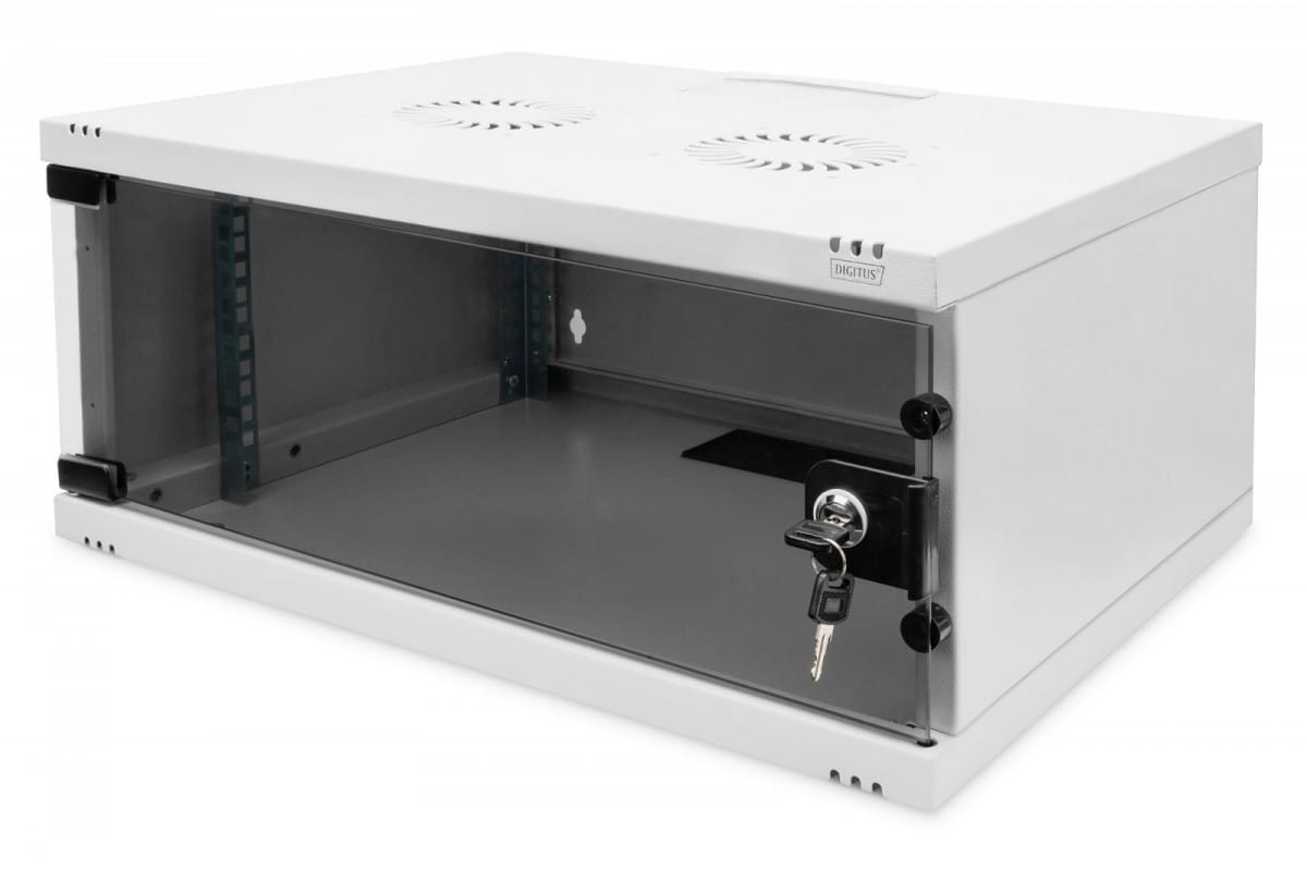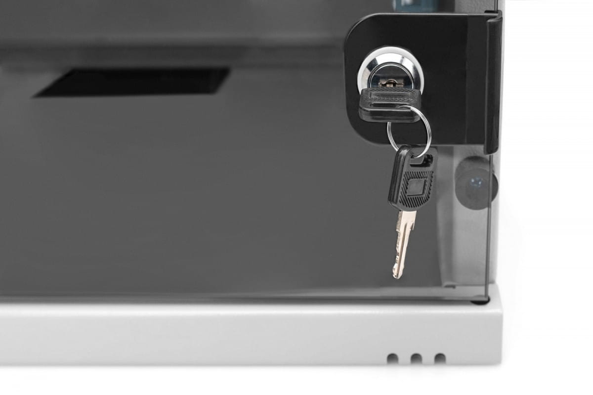 Szafa teleinformatyczna DIGITUS do montażu ściennego wyposażona jest w przeszklone drzwi oraz przepust kablowy w dachu i w podłodze. Konstrukcja stalowa wykonana z blachy stalowej o grubości do 1,5 mm. Istnieje możliwość zmiany strony montażu zawiasów drzwi oraz regulacja głębokości. Szafy rack są dostarczane w stanie niezmontowanym, w płaskiej paczce. Montaż odbywa się w kilku prostych krokach dzięki dołączonej instrukcji krok po kroku.