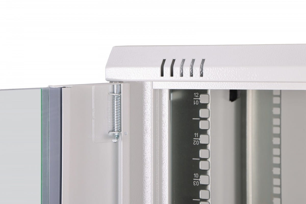 Pozostałe parametry: Drzwi przednie szklane, pojedyncze Głębokość: 600 mm Kolor: Jasnoszary, RAL 7035 Nośność: 60 kg Panele boczne z dwóch stron Szerokość: 600 mm Typ szafy: Szafa wisząca Wysokość [U]: 12