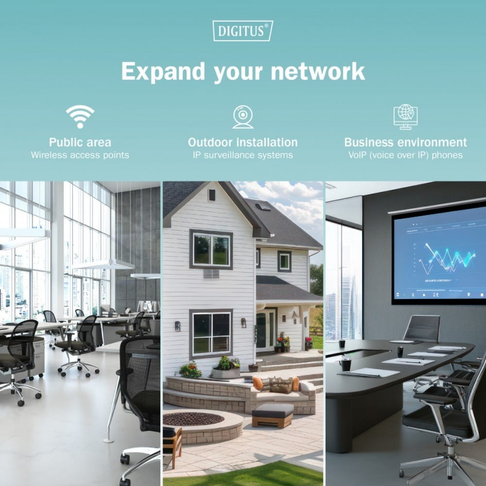 - Kompatybilność: Obsługuje standardy IEEE802.3af/at, idealny dla wszystkich kompatybilnych urządzeń PoE