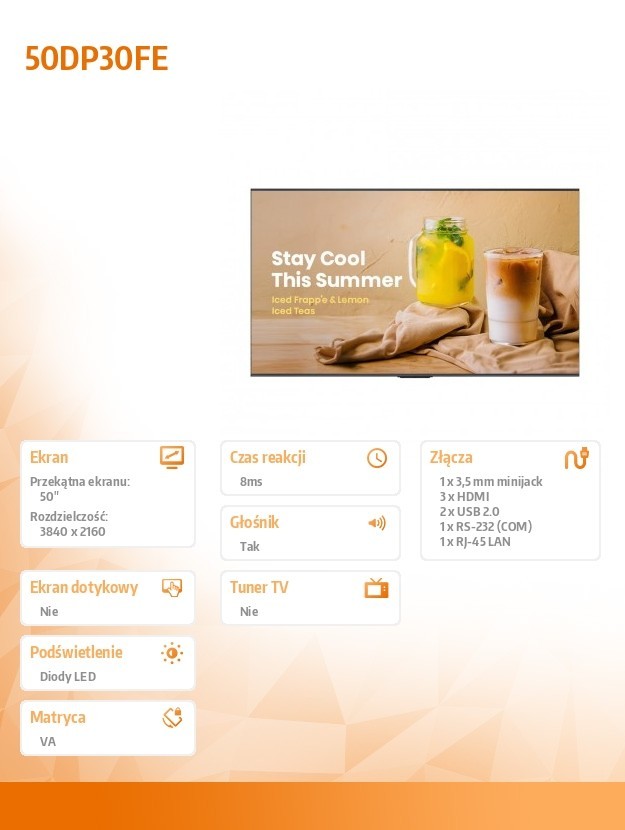 Wyświetlacz obsługuje zarówno orientację pionową (portrait), jak i poziomą (landscape), co pozwala na elastyczną instalację w sklepach, muzeach, na stadionach oraz w środowiskach biurowych, przy zachowaniu spójnej jakości obrazu 4K.