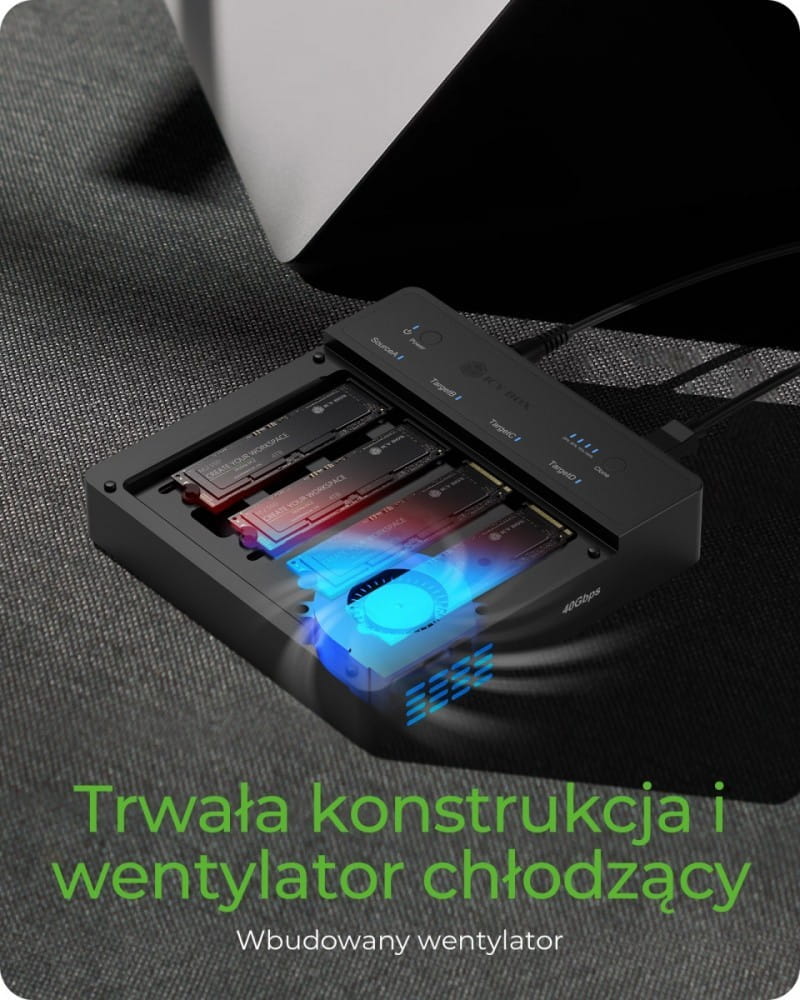 1:3 Offline Cloning: Umożliwia duplikowanie danych z jednego NVMe M.2 SSD na maksymalnie trzy inne jednocześnie, upraszczając transfer danych. Wydajność USB4 o wysokiej prędkości: Prędkość do 40Gbps przez USB4, podczas gdy każda kieszeń SSD obsługuje prędkości do 16Gbps, idealna do szybkiego dostępu do danych. Instalacja bez narzędzi: Magnetyczna pokrywa umożliwia łatwą instalację i usuwanie SSD bez potrzeby używania narzędzi, co czyni produkt dostępnym dla każdego użytkownika. Skuteczny system chłodzenia: Wykonany z aluminiowej obudowy i z wbudowanym wentylatorem, utrzymuje optymalną temperaturę, zapewniając stabilną wydajność podczas długotrwałej pracy. Wskaźniki postępu klonowania: Diody LED pokazują postęp klonowania w 25% krokach, dostarczając na bieżąco informacje o statusie. Kompaktowy i trwały design: Wykonany z aluminium dla większej trwałości i lepszego odprowadzania ciepła, łącząc styl z funkcjonalnością.