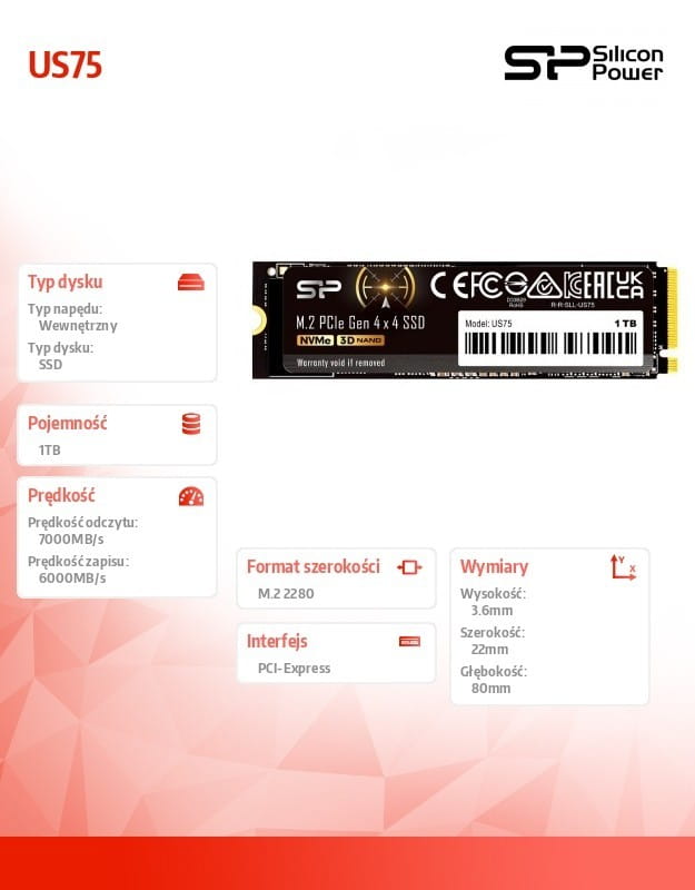 Silicon Power Dysk SSD US75 1TB M.2 PCIe Gen4x4 NVMe 1.4 7000/6000 MB/s