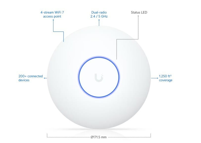 Kompaktowy, montowany na suficie punkt dostępu WiFi 7 z 4 strumieniami przestrzennymi i łączem uplink 2,5 GbE.