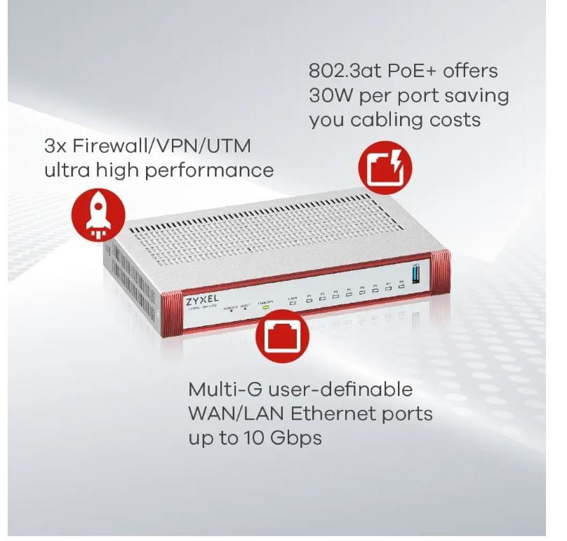 Seria urządzeń USG FLEX H, zapewnia bezpieczną, szybką ochronę z przełomową wysoką wydajnością dla wirtualnych sieci prywatnych (VPN) i ujednoliconego zarządzania zagrożeniami (UTM), co stanowi wielowarstwowe podejście do ochrony zapory sieciowej, infrastruktury sieciowej i podłączonych użytkowników poprzez wykorzystanie wysokowydajnego sprzętu Zyxel i najnowocześniejszej architektury AI Security Cloud.