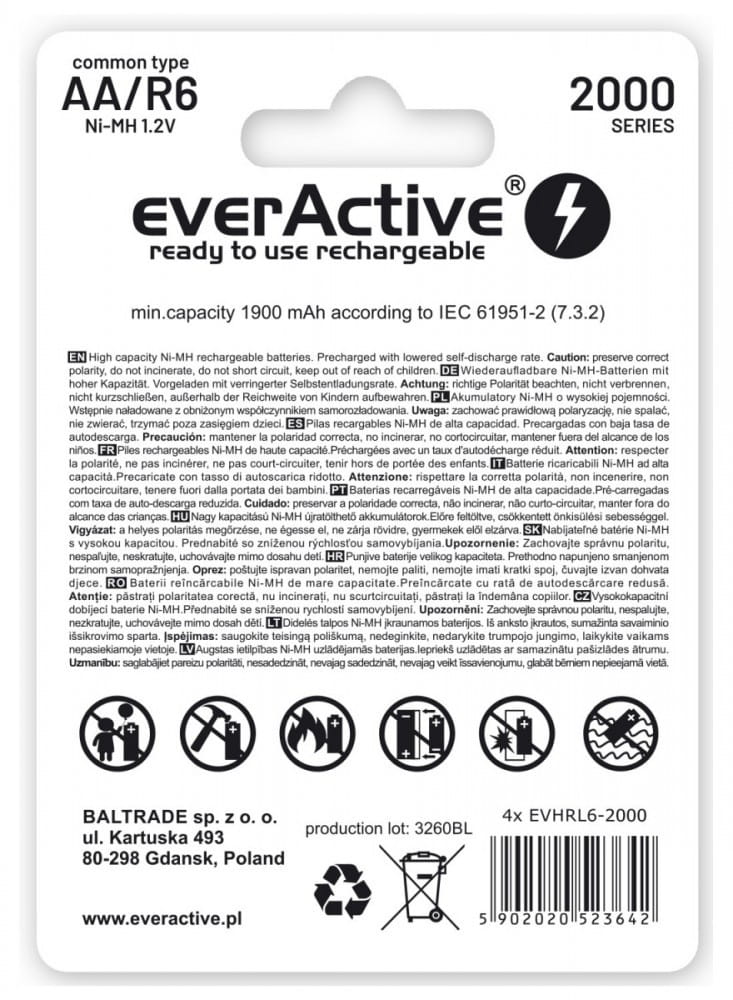 4 x innowacyjny akumulator R6 AA 2000 mAh everActive wykonany w technologii "ready to use". Idealne dla wymagających lamp błyskowych, latarek, reflektorów, aparatów cyfrowych, czy odtwarzaczy CD/MP3. Pojemność akumulatorów everActive jest zbliżona do baterii alkalicznych, ale można je wielokrotnie ładować (nawet do 1200x). Ponadto akumulatory dużo lepiej znoszą rozładowanie dużym prądem.