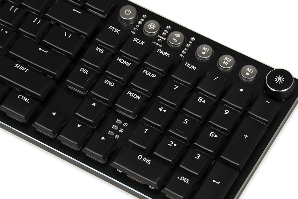 Klawiatura niskoprofilowa z mechanicznymi przełącznikami zapewnia wysoką jakość oraz wygodę rozgrywki i pracy. Obudowa wykonana z aluminium. Piękne podświetlenie LED, z podziałem na bloki funkcyjne znane z klawiatury Aurora K-3 ułatwia pracę a jednocześnie sprawia, że klawiatura wygląda bardzo atrakcyjnie.
